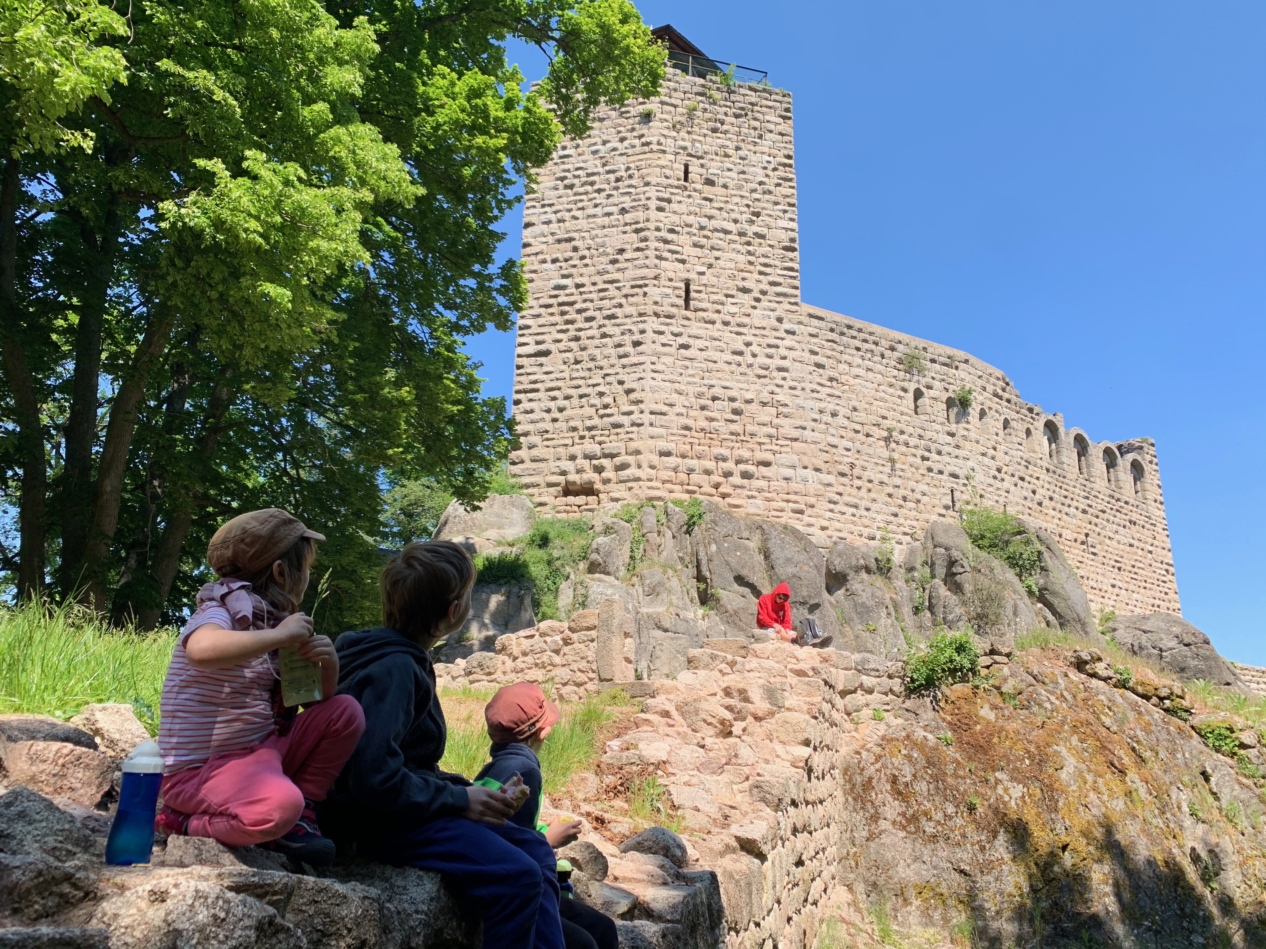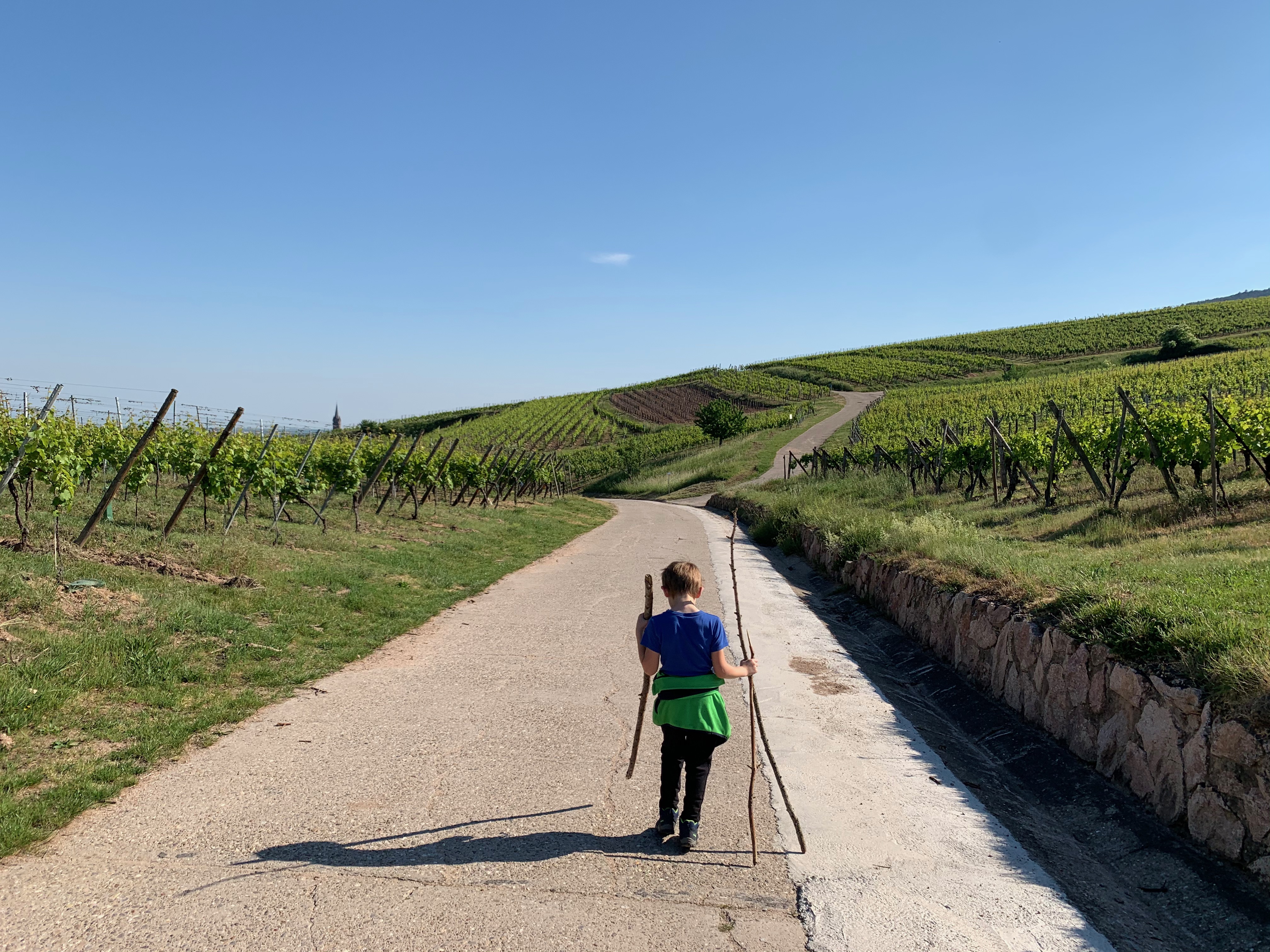 On a choisi une boucle au-dessus de Dambach-la-Ville, la « Grimpée eu Bernstein ». C’était vraiment chouette… mais aussi fatiguant. On s’attendait à faire 8,8km (ce qui est déjà pas mal avec les 3 loulous, on s’est retrouvés à en faire plus de 15 ! Les explications étaient vraiment mauvaises, mais tout finissait pourtant par coller. Je vais me méfier de ce livre maintenant !