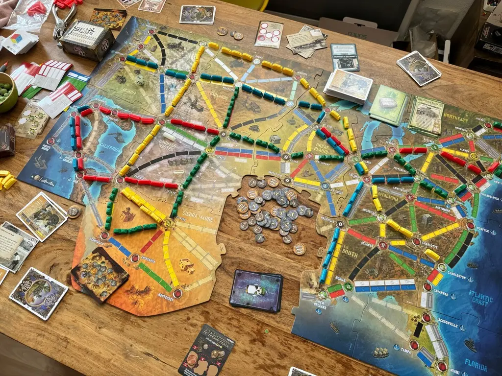 On a presque complété la carte (elle le sera à la fin de la partie), et on arrive au bout de la campagne (encore 2 parties après celle-là). J’avoue que j’étais sceptique sur un Aventurier du Rail Legacy… mais mes lectures m’ont convaincu… et j’ai bien fait car on aime vraiment beaucoup ! C’est vraiment une chouette expérience, variée et intéressante